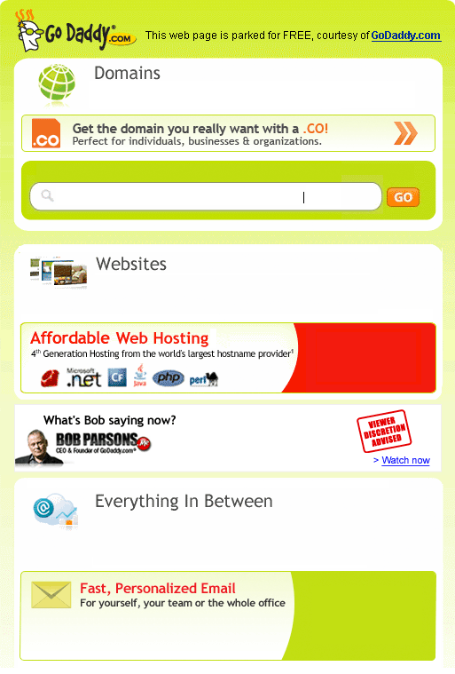 GoDaddy.com GoDaddy.com Domains Get the domain you really want with a .CO! Go Websites Affordable web hosting www.bobparsons.me Everything in between Fast, Personalized Email